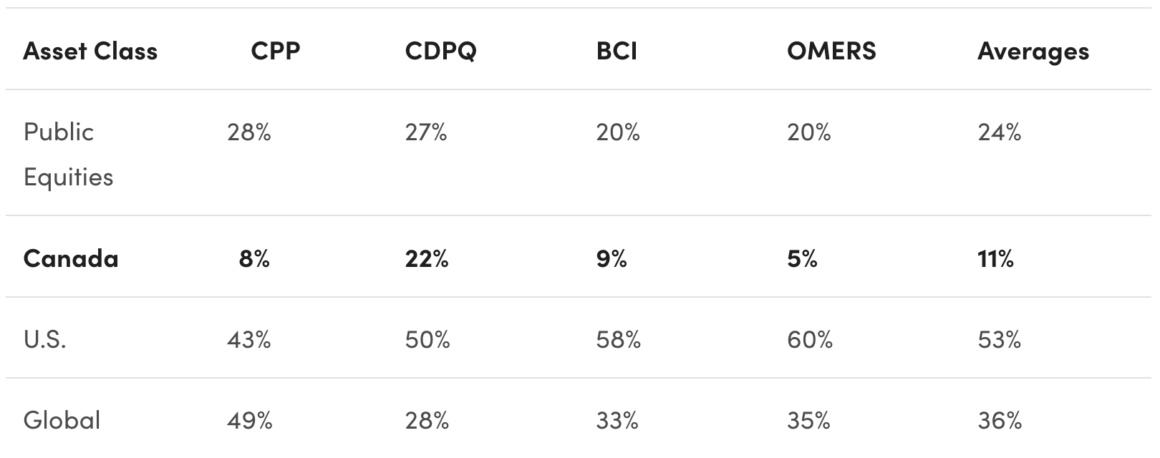 Canada’s largest pension funds collectively allocate an average of ~11% of their public equity portfolios to Canadian companies.