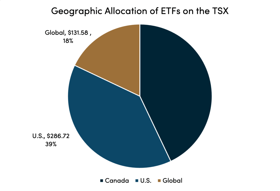 According to information published by Bloomberg, among all the ETFs listed on the TSX, approximately 57% of capital invested in ETFs is invested into U.S. and Global companies compared to 43% to Canadian-listed companies.⁴