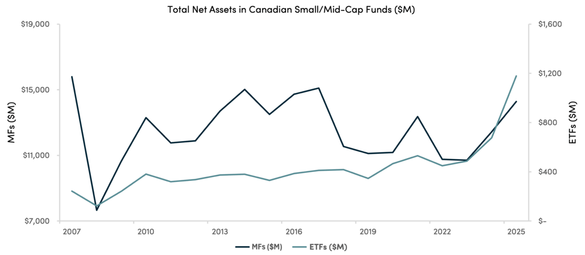 Historically, Canadian small and mid-cap mutual funds have accounted for the majority of assets in this class, as ETFs have been predominantly concentrated in large-cap securities. More recently, however, data from Morningstar indicates that small-cap ETFs have started to show steady inflows, with a notable uptick of around $500 million inflow in 2025.⁵
