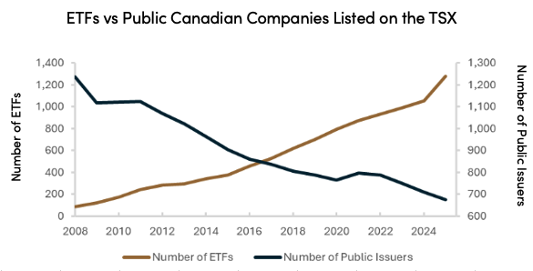 Since the early 90’s and accelerating after the 2008 Financial Crisis, Canada’s capital markets have evolved in how capital is raised and allocated, including the growth of exchange‑traded funds (ETFs) and a reduction in the number of companies listed on the Toronto Stock Exchange (TSX).
