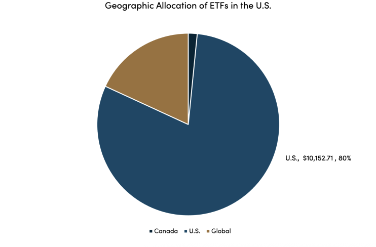 Meanwhile, U.S. listed ETFs invest domestically, with approximately 80% of assets invested in ETF products domiciled in the U.S., with just under 2% allocated to Canadian securities, as illustrated below.⁴